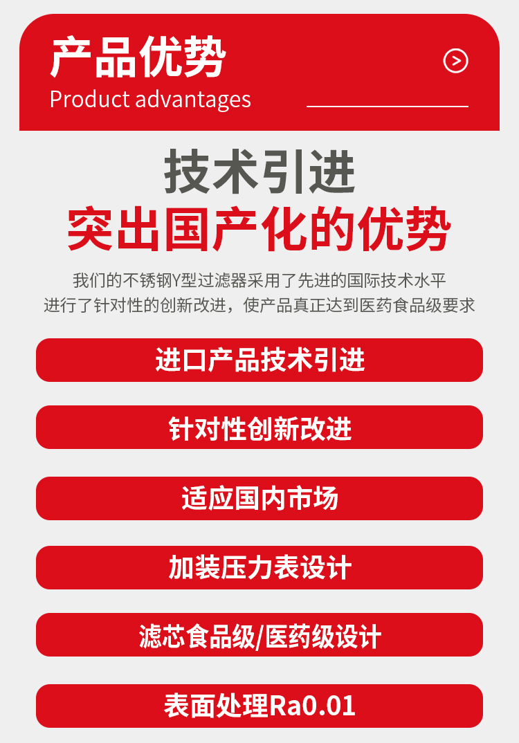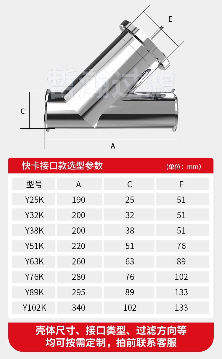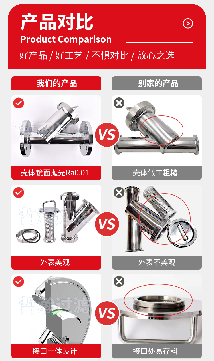 - 结构先进:Y型结构使流体流动顺畅,压力损失小,通常在额定流速下压损为0.05 - 0.1米水柱。