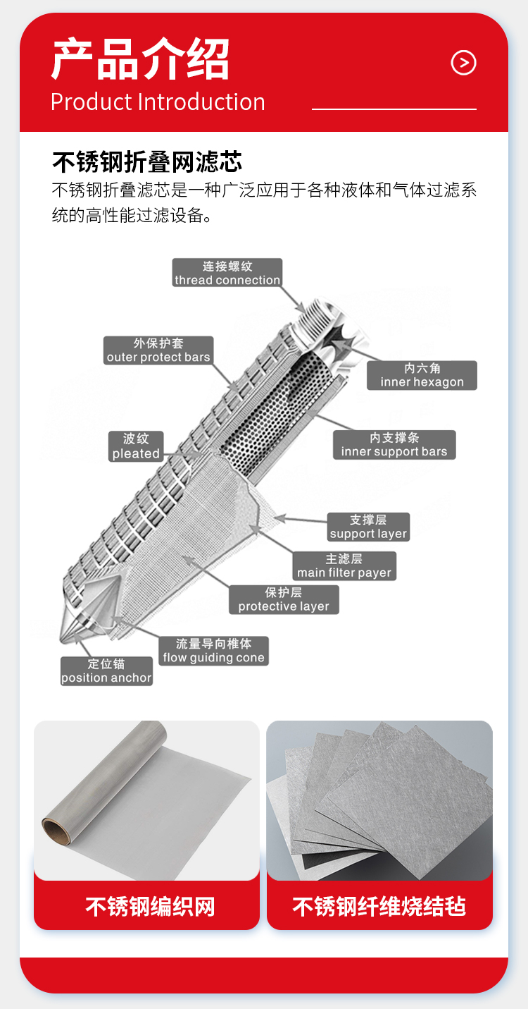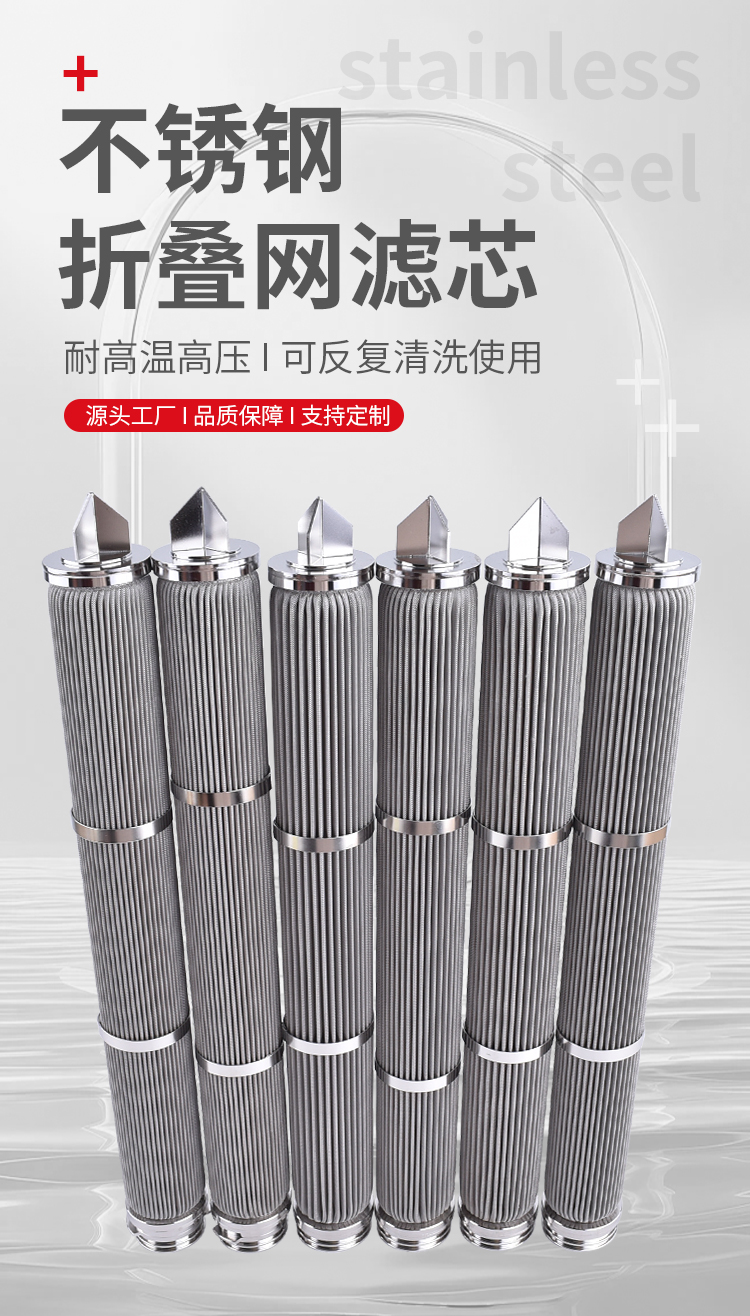 不锈钢折叠网滤芯是采用不锈钢纤维烧结毡和不锈钢编织网等为主要过滤介质,通过折叠设计增大过滤面积。其滤芯内部由不锈钢网折叠而成,形成多层过滤层,每一层都能有效拦截杂质。当流体通过滤芯时,杂质被层层拦截,清洁的流体则顺利通过。