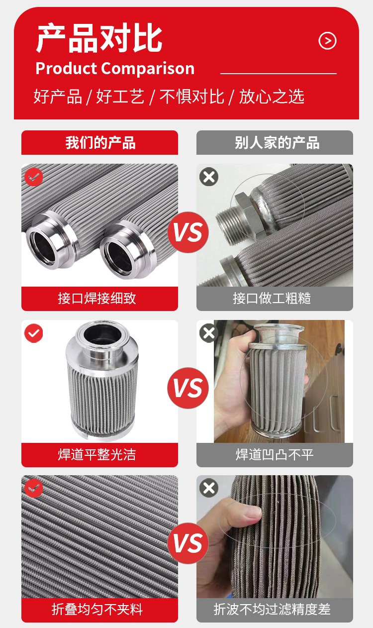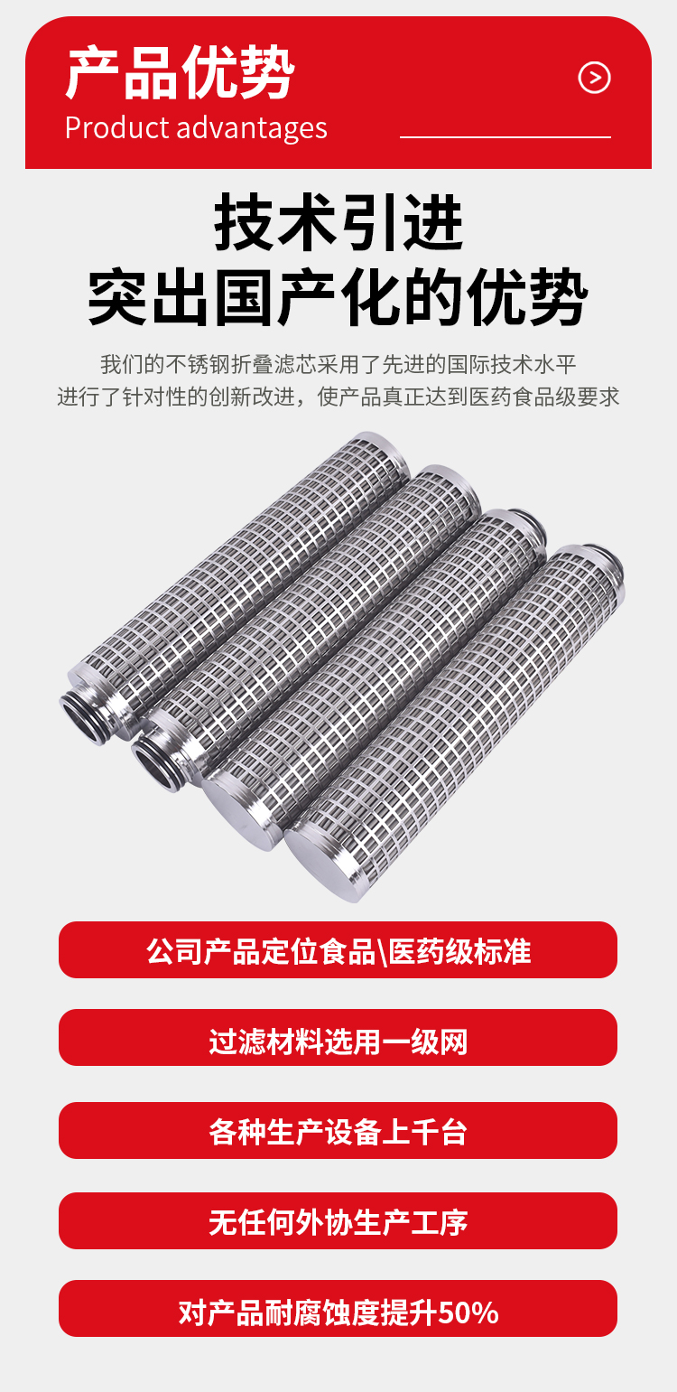 • 过滤性能佳:孔隙率高、透气性好、阻力小、使用压差低;折叠设计增大过滤面积,纳污量大;过滤精度高,通常在1-200μm,可定制。