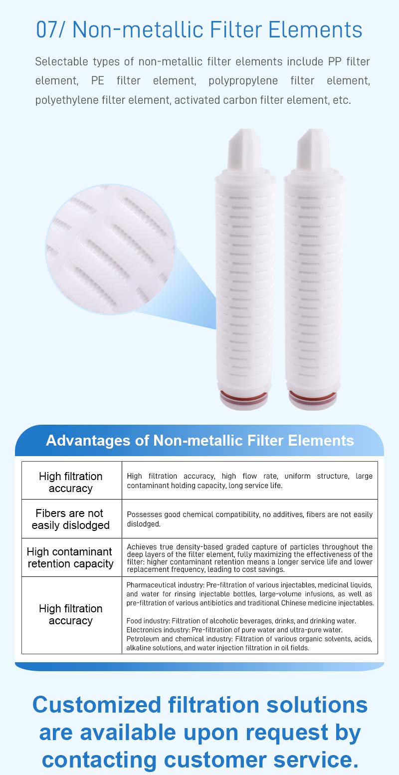 In the chemical industry, during the transportation of chemical raw materials and the feeding of reaction vessels, impurities in acid and alkali solutions, organic solvents, etc. are filtered to protect equipment and improve product quality.