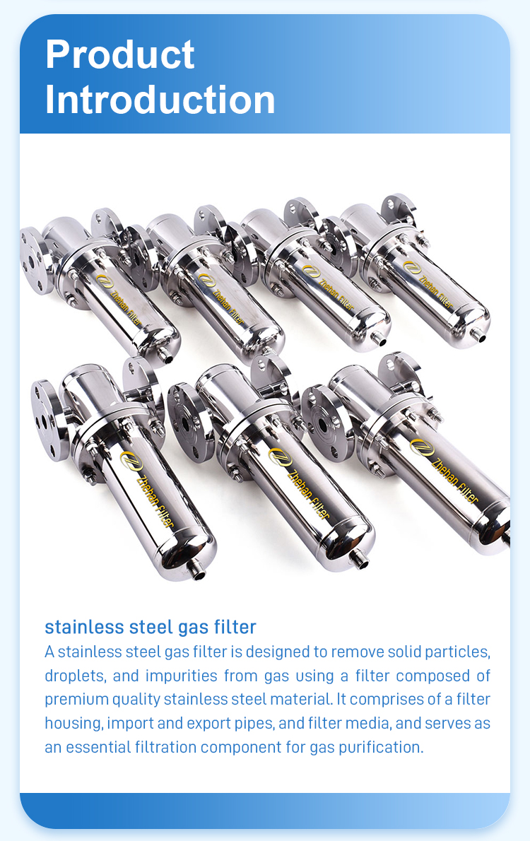 Stainless steel gas filters are devices used for filtering gases, typically made of 304 or 316L stainless steel. They come in various types, such as deep filtration through metal sintering and high-efficiency membrane gas filters. It can remove impurities from the gas and is available in various specifications and filter elements to meet different flow rates and filtration requirements.