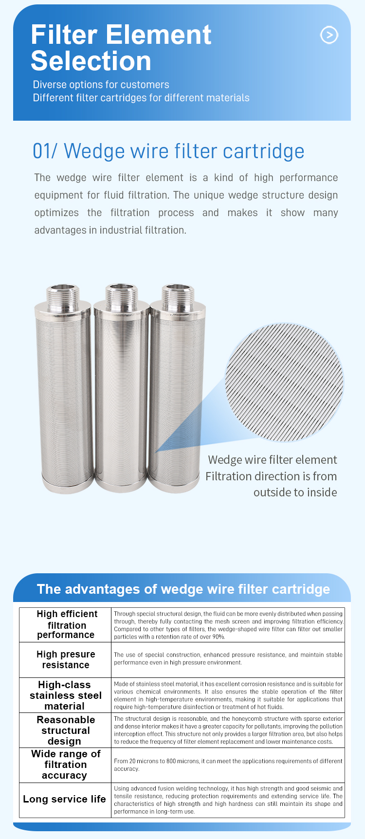 - Stainless steel wedge-shaped wire filter element