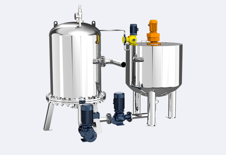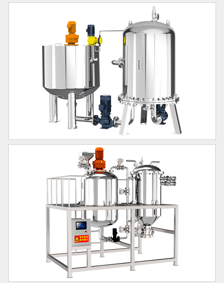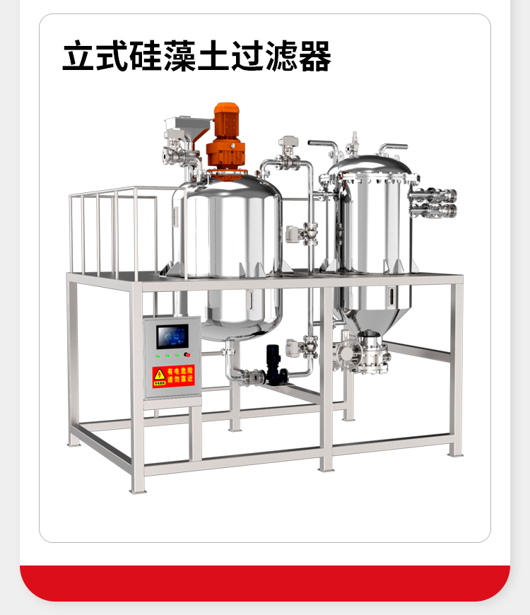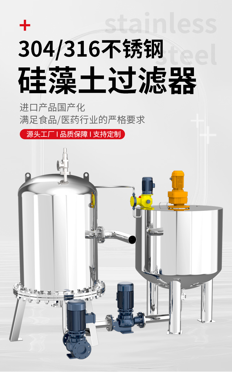 硅藻土过滤器是以硅藻土为主要过滤介质,利用其细微性、多孔性及吸附特性去除液体中悬浮颗粒、胶体等杂质的装置。其工作原理是先进行硅藻土预涂,在过滤介质表面形成一层硅藻土涂层,待过滤液体在泵压力作用下通过预涂层进入收集腔内,颗粒及高分子被截流在预涂层,澄清液体流出过滤器。